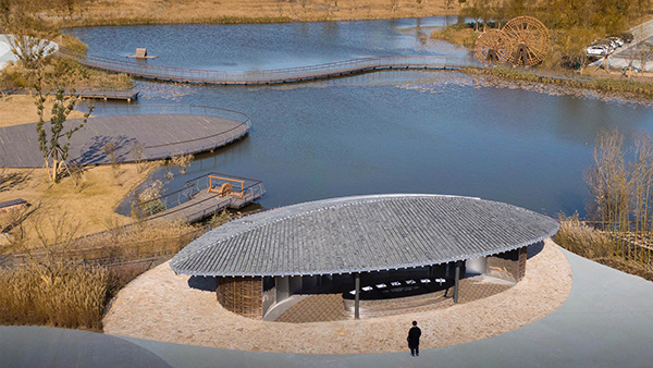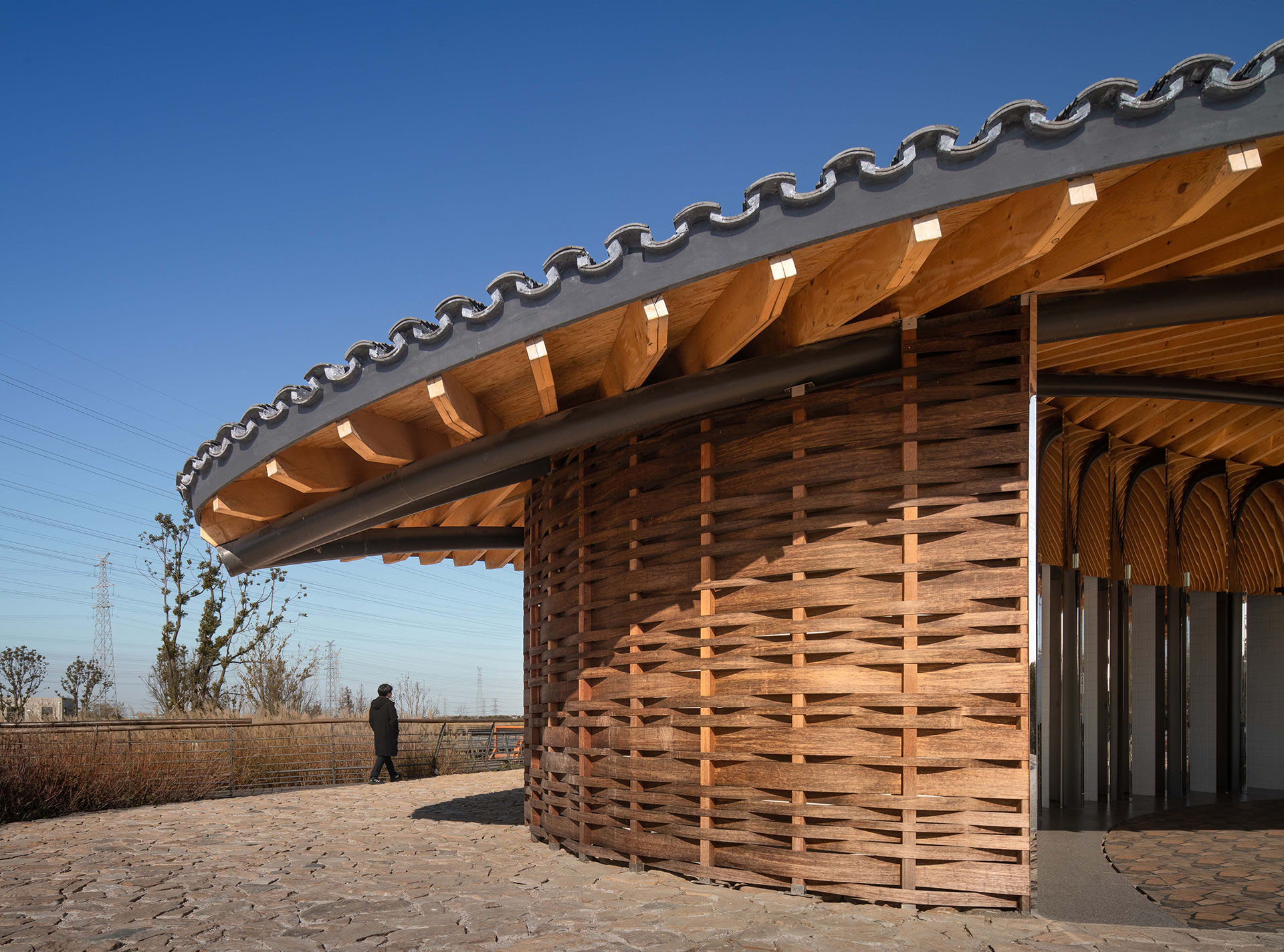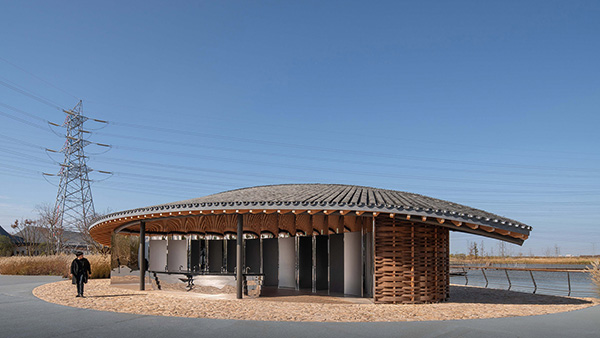 景观公厕的改造考虑整体入口空间形态,而希望尽量消减建筑本身的物质感;屋顶重而墙轻,是整个建筑希望呈现的整体感知;前区公用洗手台所形成的灰空间与后部反射材料的共同作用使得重材质的屋顶也呈现了漂浮之感。