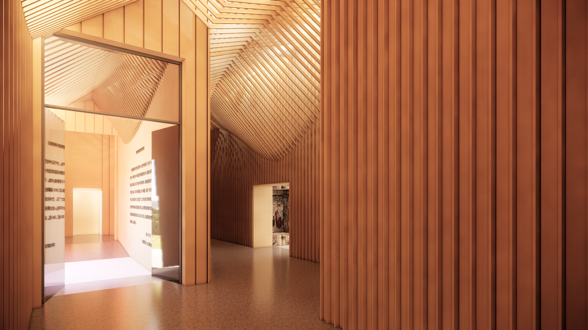 为了容纳三座原尺寸的复原石窟,我们把空间压榨到了极致,但还是尽量留出一个前厅作为缓冲,既是参观人流也是对室内外气候